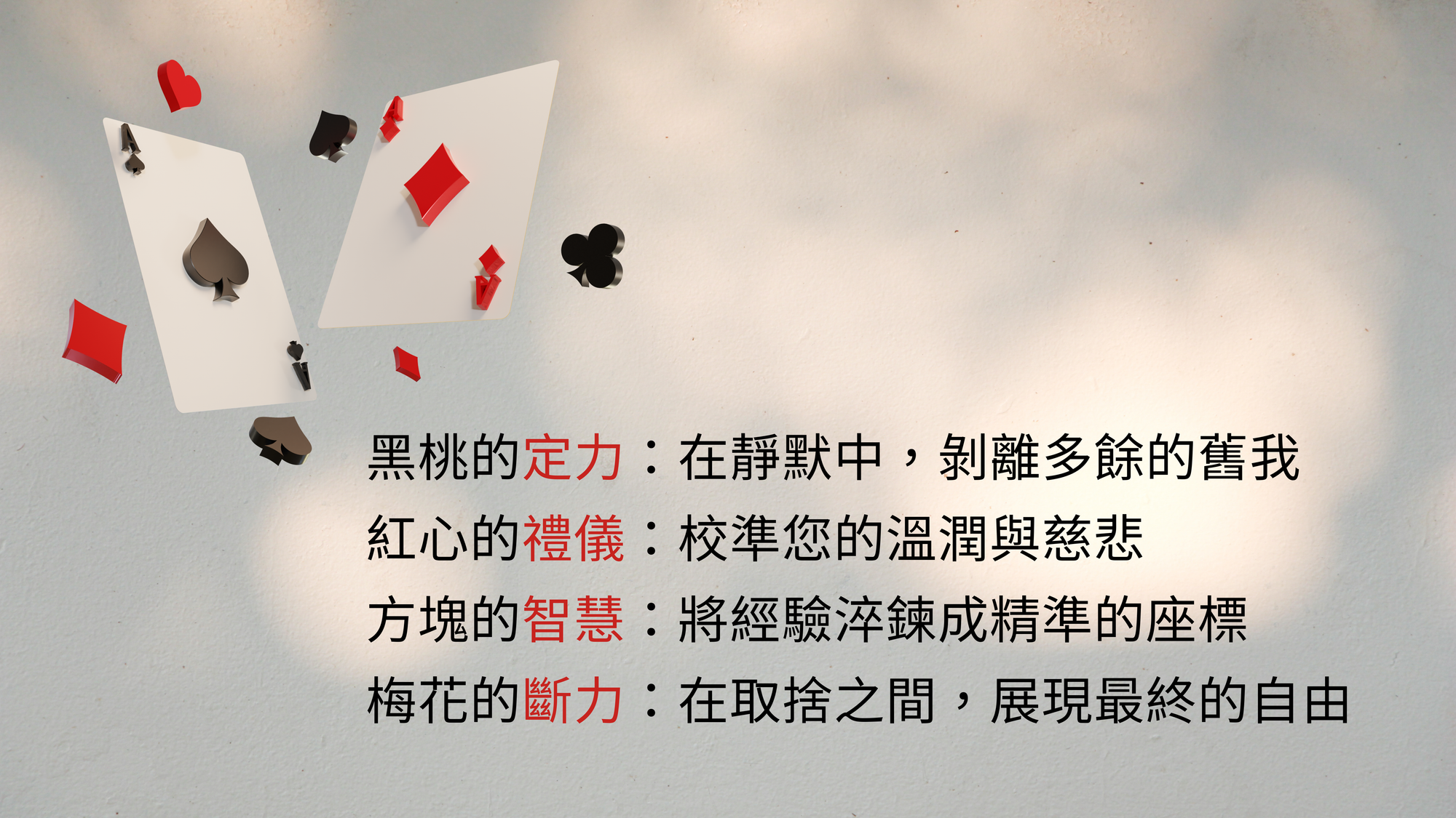 這 52 枚密碼,如同撲克牌組中的四個花色,能排列出人生的千變萬化。我將陪你在變局中重新洗牌: